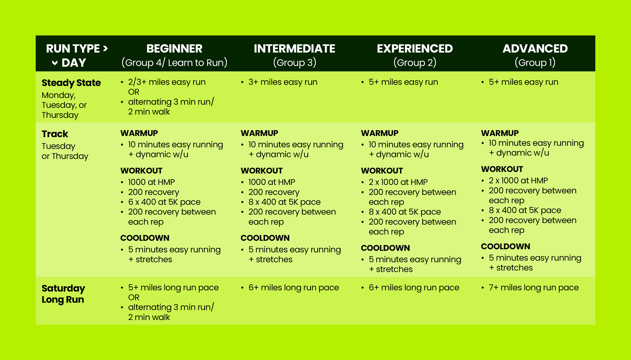 Saturday Long Run: See if you can hold a pace within two minutes/mile of your goal half-marathon goal pace! Aim for a conversational pace!