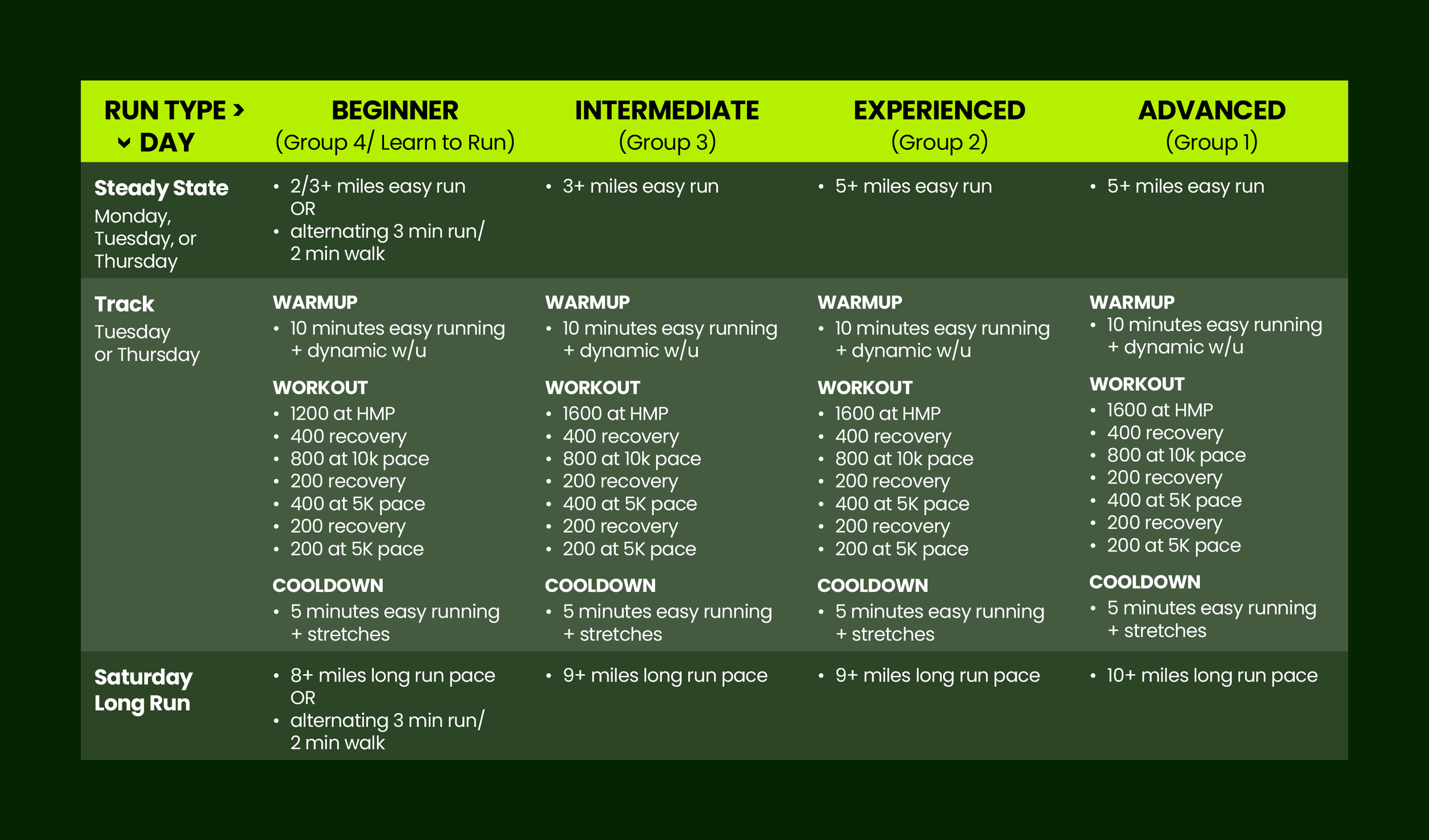 Saturday Long Run: See if you can hold a pace within 2 minutes/mile of your goal half-marathon goal pace or try to get progressively faster! Test to see how your goal half marathon pace feels on longer runs.