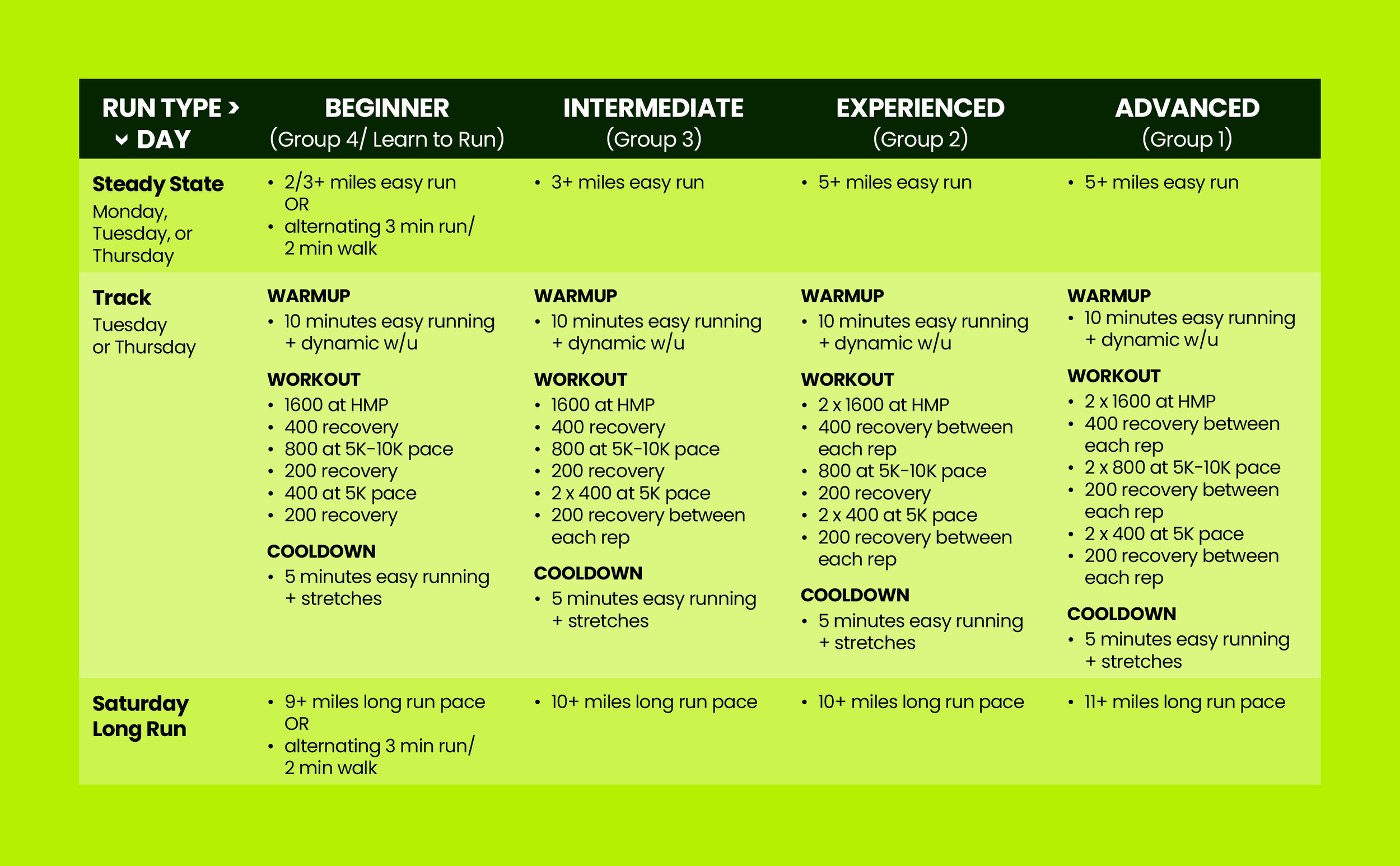 Saturday Long Run: See if you can hold a pace within 2 minutes/mile of your goal half-marathon goal pace or try to get progressively faster! Test to see how your goal half marathon pace feels on longer runs.