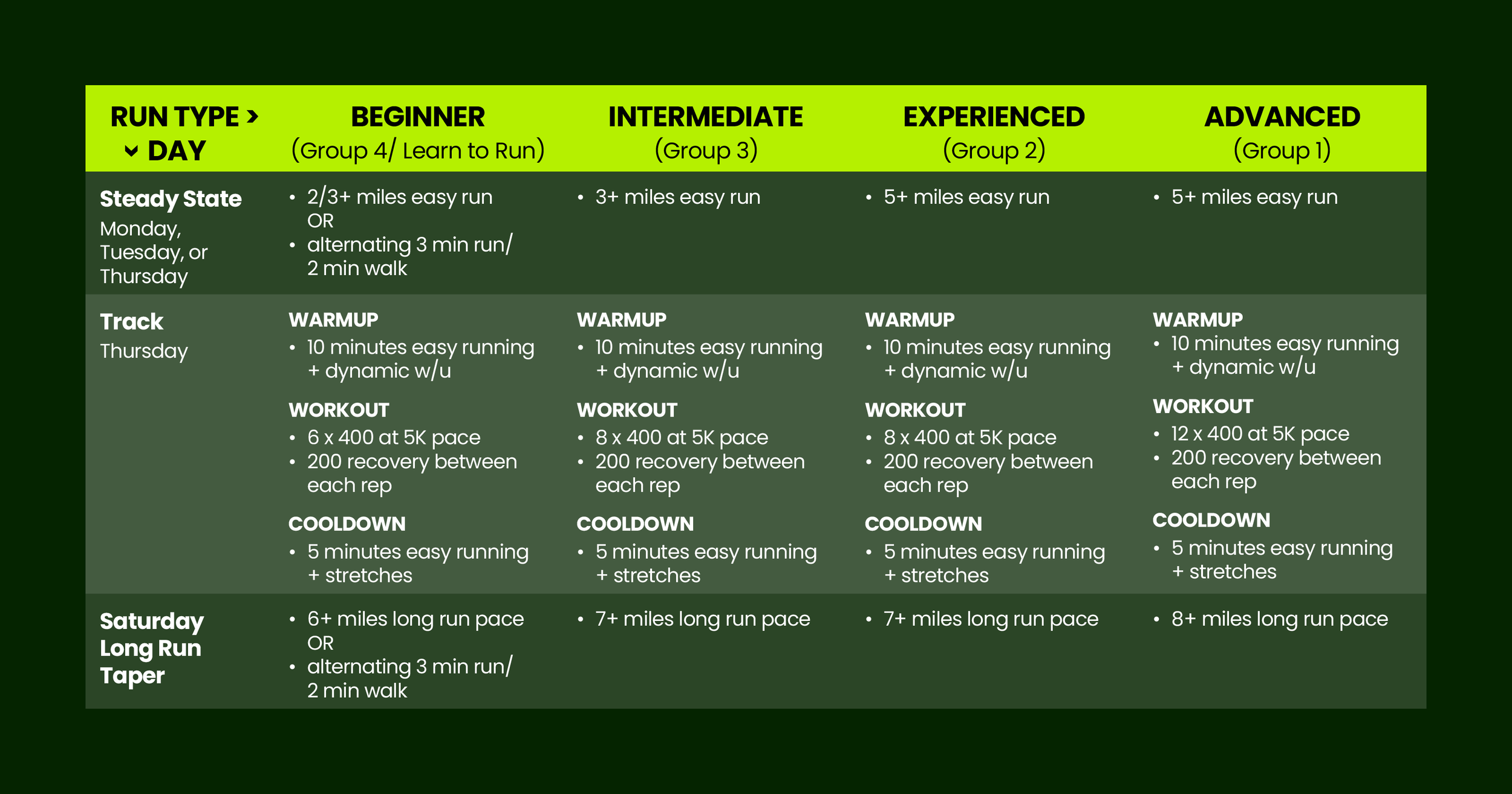 Saturday Long Run: See if you can hold a pace within two minutes/mile of your goal half-marathon goal pace! Aim for a conversational pace!